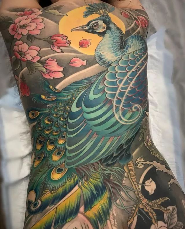 日式满背孔雀纹身 日式满背孔雀纹纹身手稿 日式满背孔雀纹纹身手稿图案 成都千灵刺青纹身